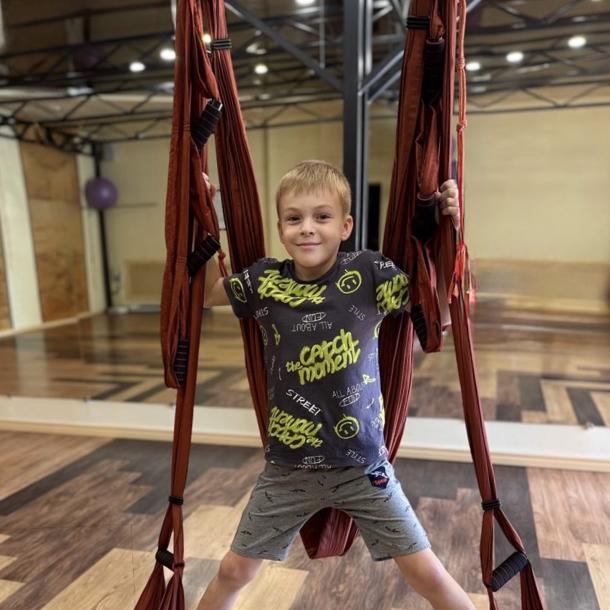 Занятия проходят в специальных гамаках, подвешенных к потолку, обеспечивая комфорт и безопасность вашего ребенка.